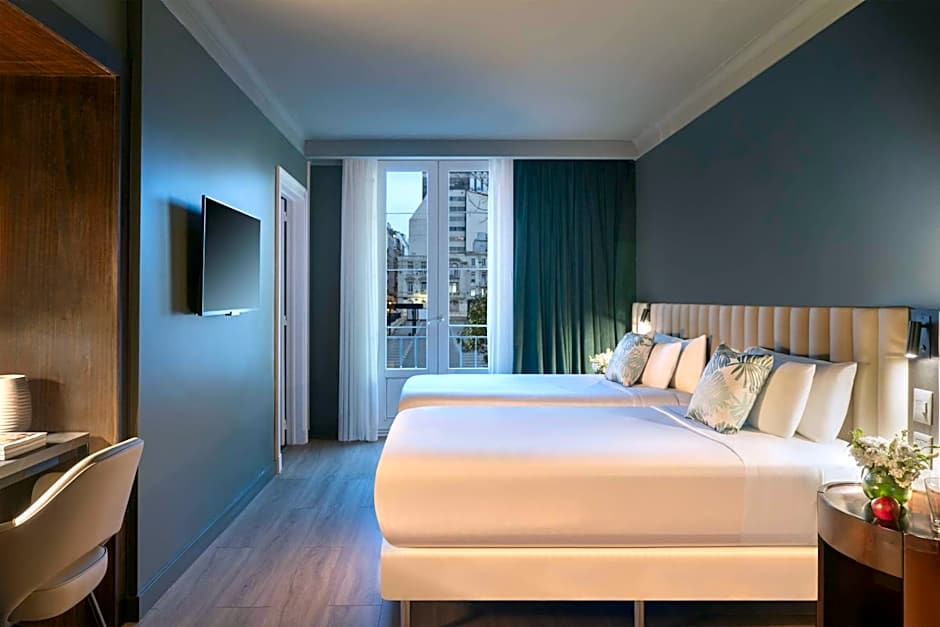 Spacious suite featuring stylish decor, free Wi-Fi, air conditioning, LCD cable TV, a mini-bar, private bathroom with hairdryer, and street views.